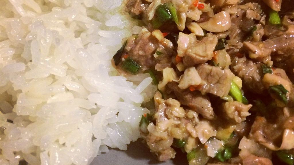 boeuf, tripes, jus de citron, sauce nuoc mam, gingembre, piment, menthe, ciboulette, échalote, ail, riz gluant
