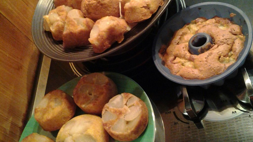 poire, farine, sucre en poudre, oeuf, lait, huile, levure chimique, sel, beurre, oeuf, sucre en poudre