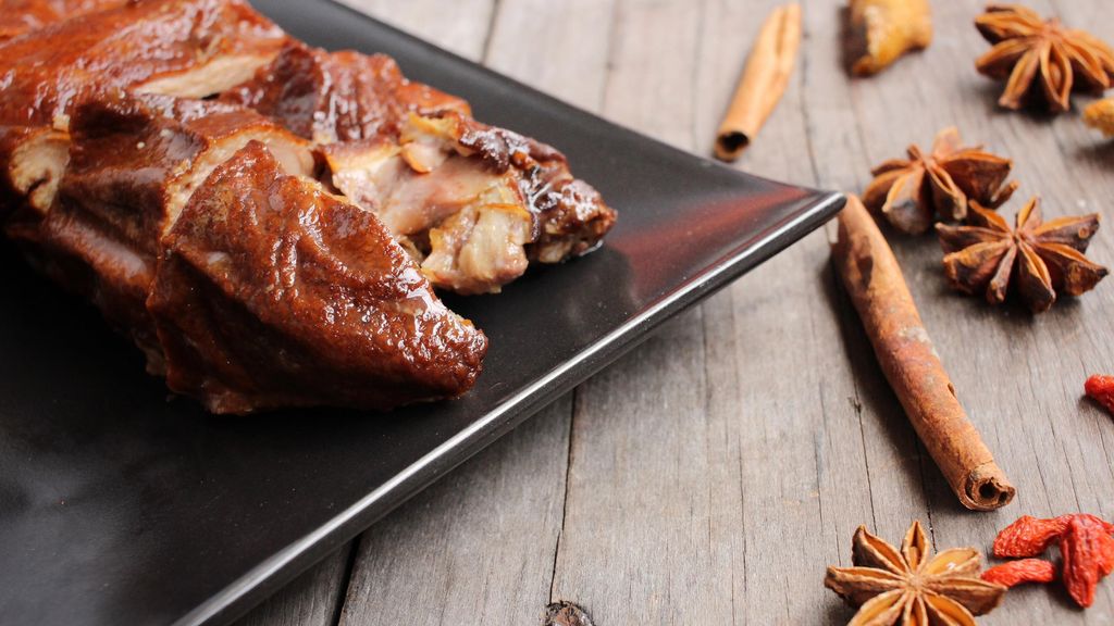 canard, épices, cumin, oignon, ail, sauce soja, miel liquide, glutamate, poivre, sel