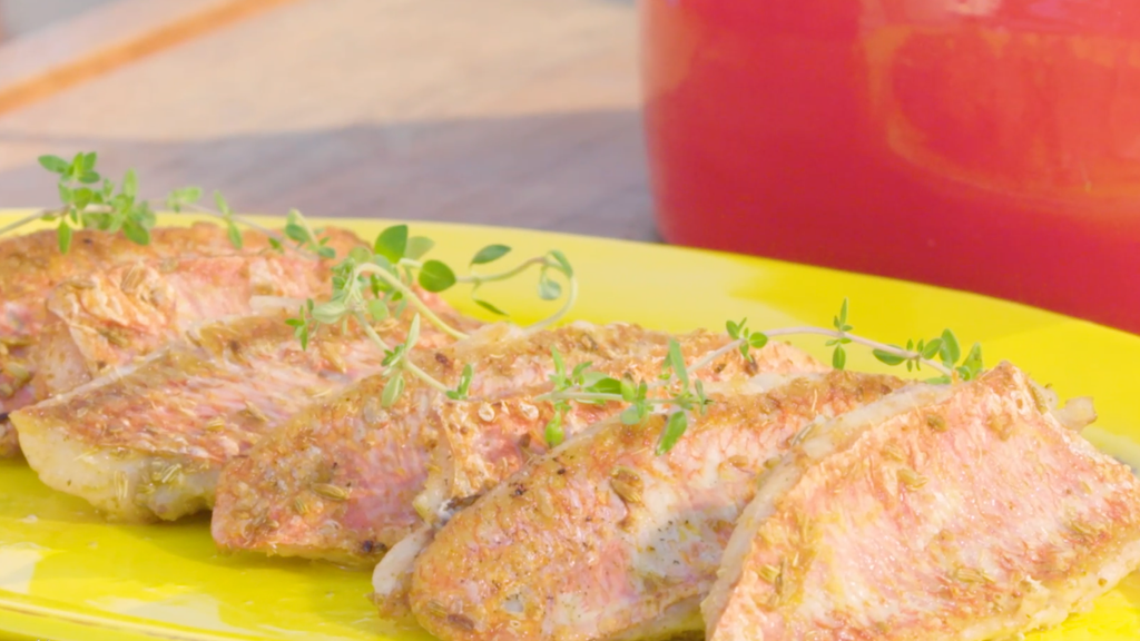 filets de rougets barbet désarêtés et écaillés, graines de fenouil, cumin en poudre, gingembre en poudre, citron, courgette, baies roses,…
