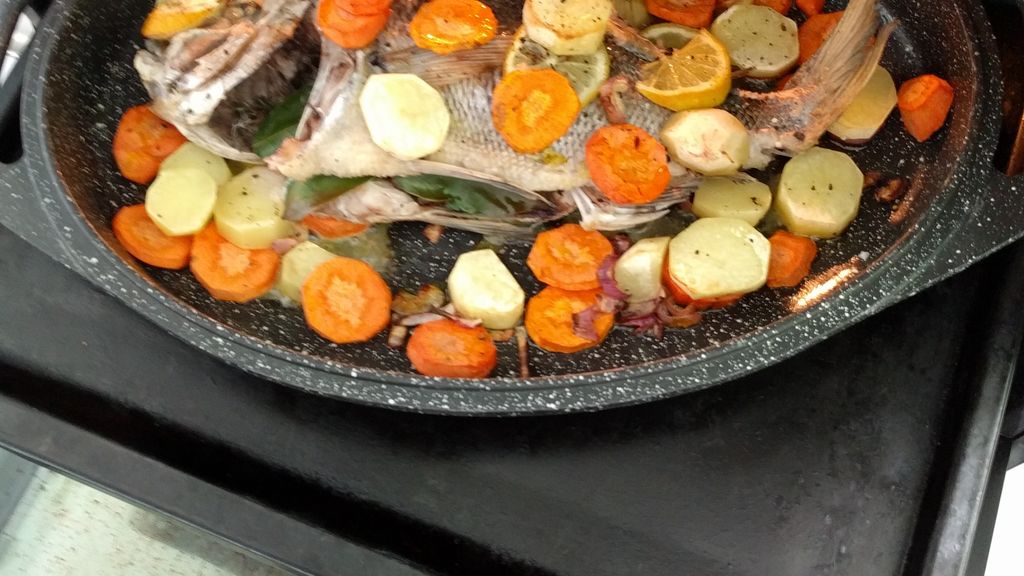 dorade, pomme de terre, carotte, oignon, thym, laurier, citron, huile d'olive, vin blanc sec