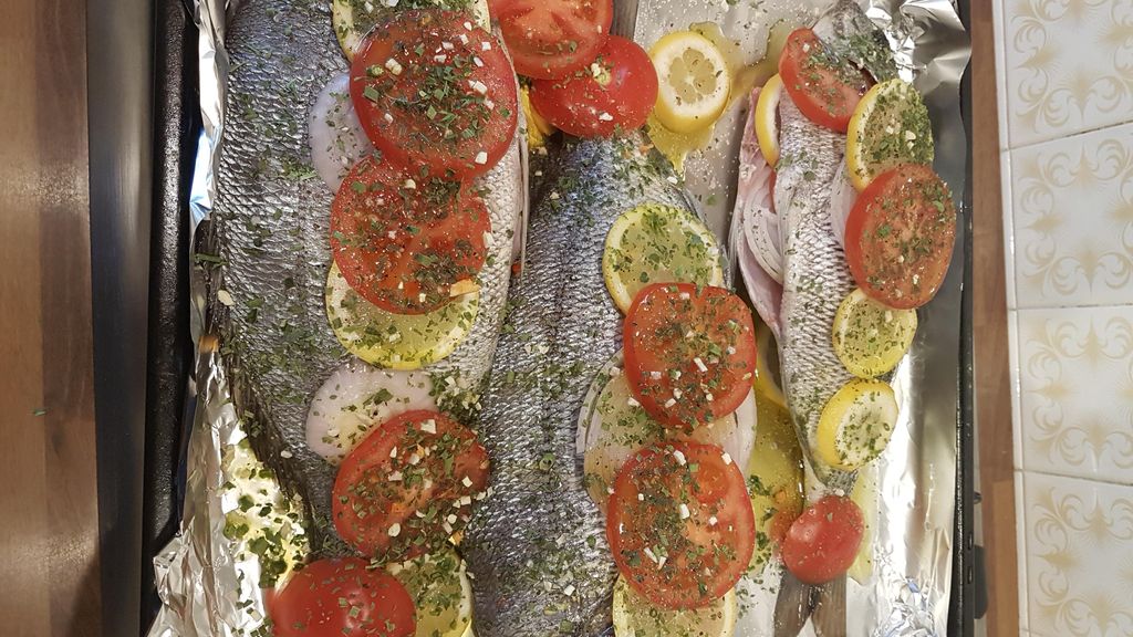 dorade, citron, oignon, tomate, herbes aromatiques, sel, poivre, huile d'olive