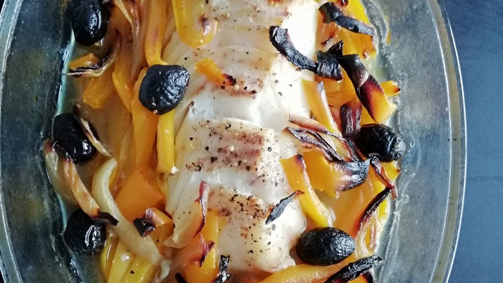 cabillaud, olives, poivron jaune, huile d'olive, oignon, sel, poivre 5 baies
