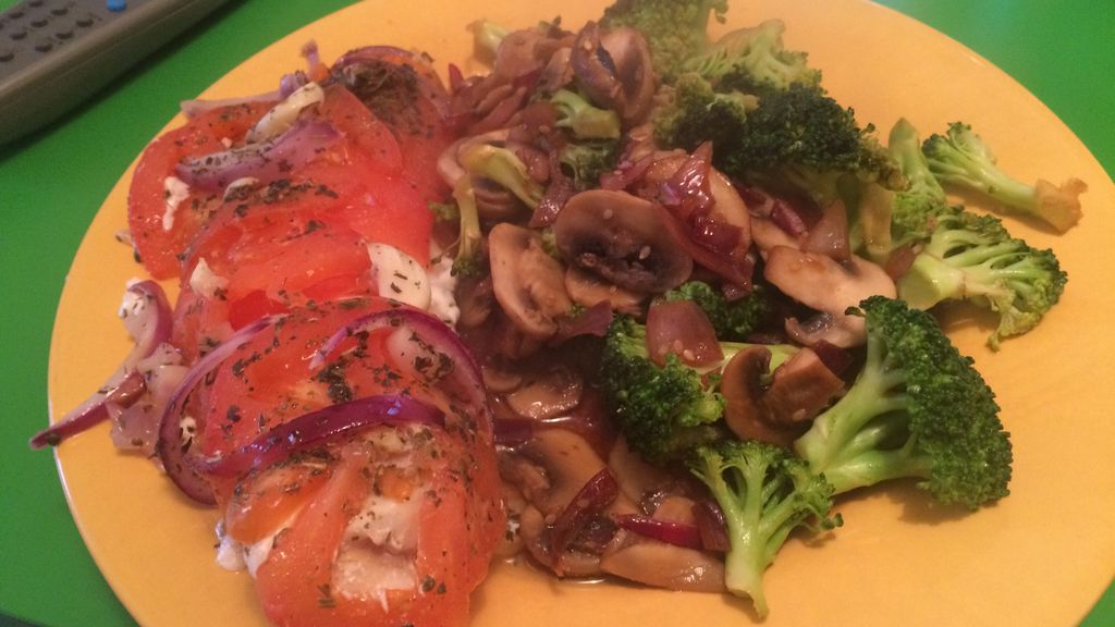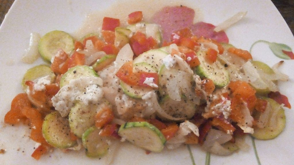 lieu noir, courgette, tomate, huile d'olive, moutarde, sel, poivre