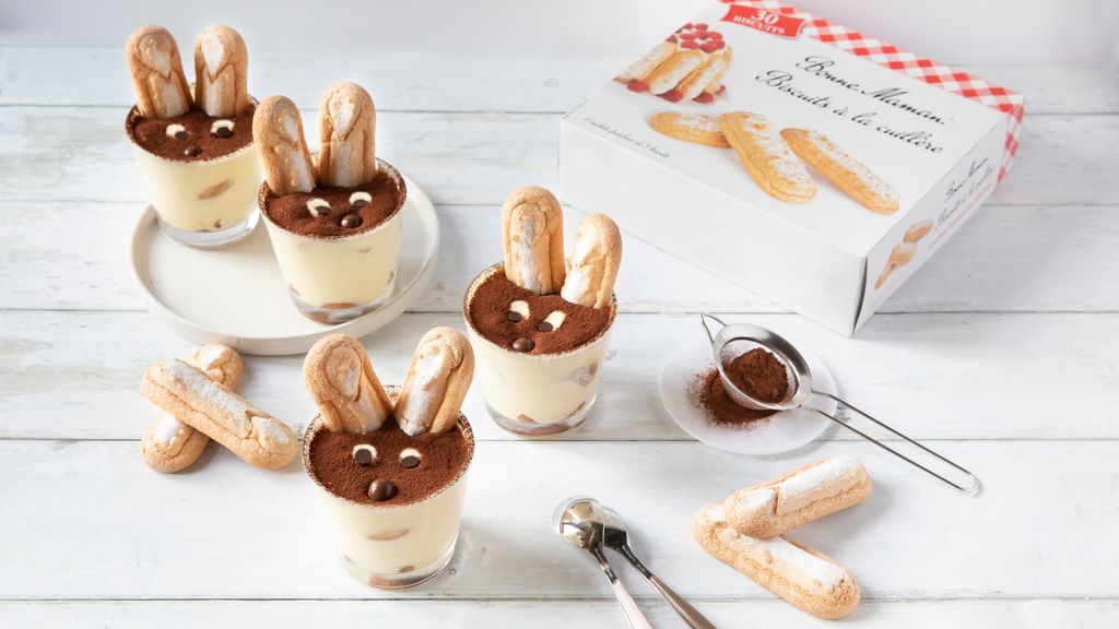 Biscuits à la Cuillère Bonne Maman, mascarpone, oeuf, sucre, cassonade, lait demi-écrémé, cacao en poudre, pépites de chocolat, petits œufs…