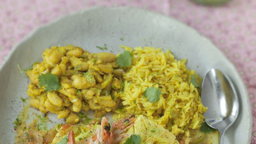 Poisson, oignon, tomate, ail, gingembre, thym, piment vert, citron vert, haricot, coriandre, oignon, curcuma, riz basmati, crevettes, gambas