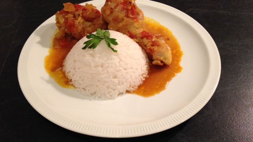 cuisse de poulet, tomate, oignon, sel, cumin, feuilles de coriandre, curcuma, poivre de Cayenne, huile d'olive