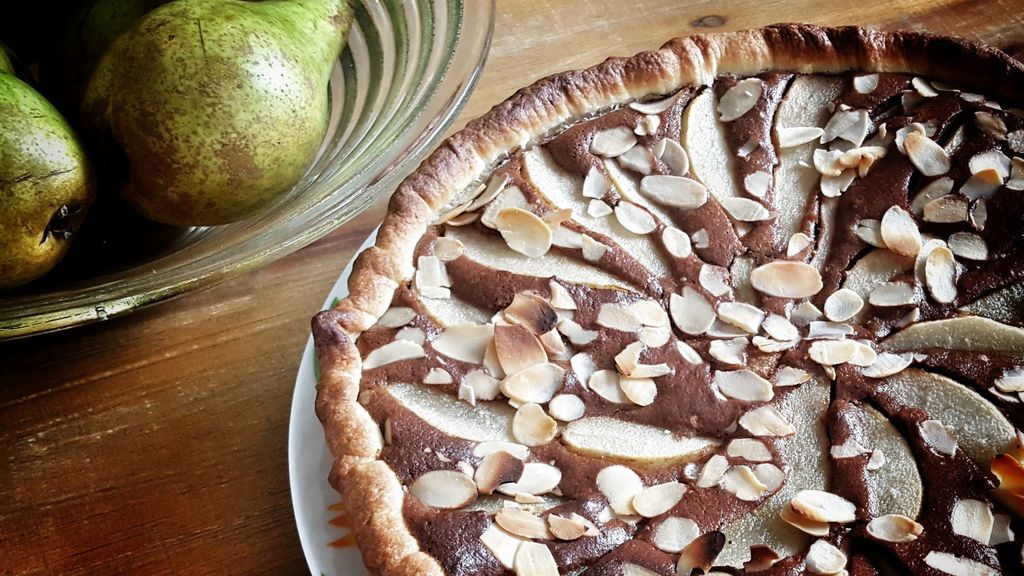 Tarte poires, chocolat, amandes et pralin : cette preparation culinaire met en valeur des ingredients de qualite.