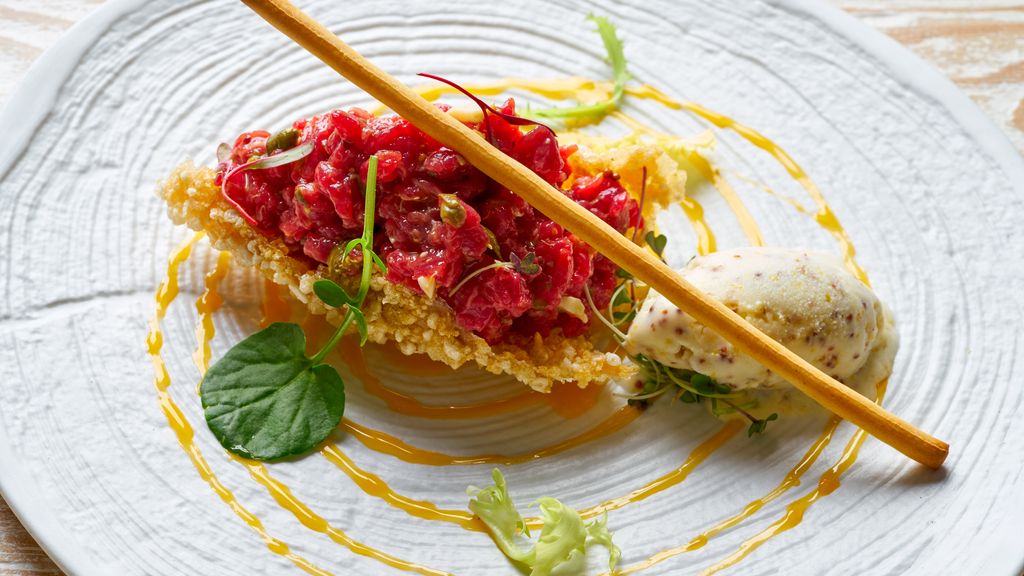 Tartare de boeuf en tuile de riz croustillante, glace moutarde : cette preparation culinaire met en valeur des ingredients de…