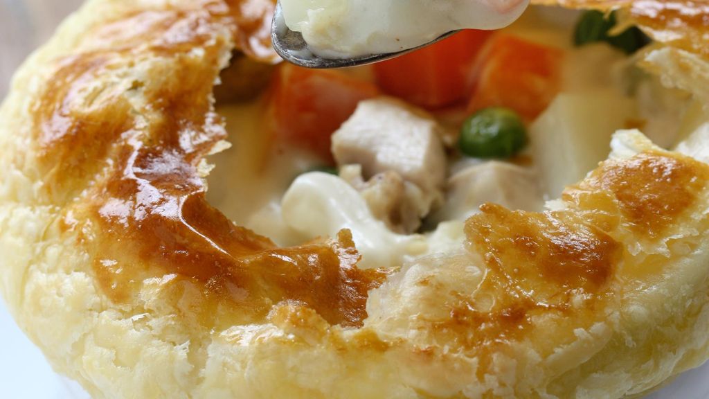 Tourte anglaise au poulet, petits pois et champignons : cette preparation culinaire met en valeur des ingredients de qualite.