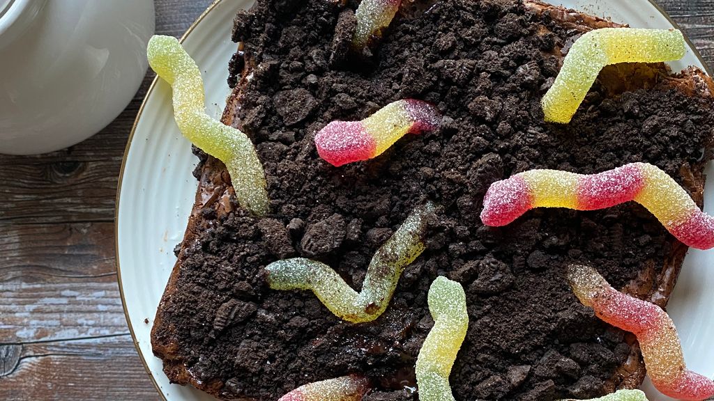 Brownie aux vers d'halloween : un dessert delicat qui marie parfaitement douceur et fraicheur.