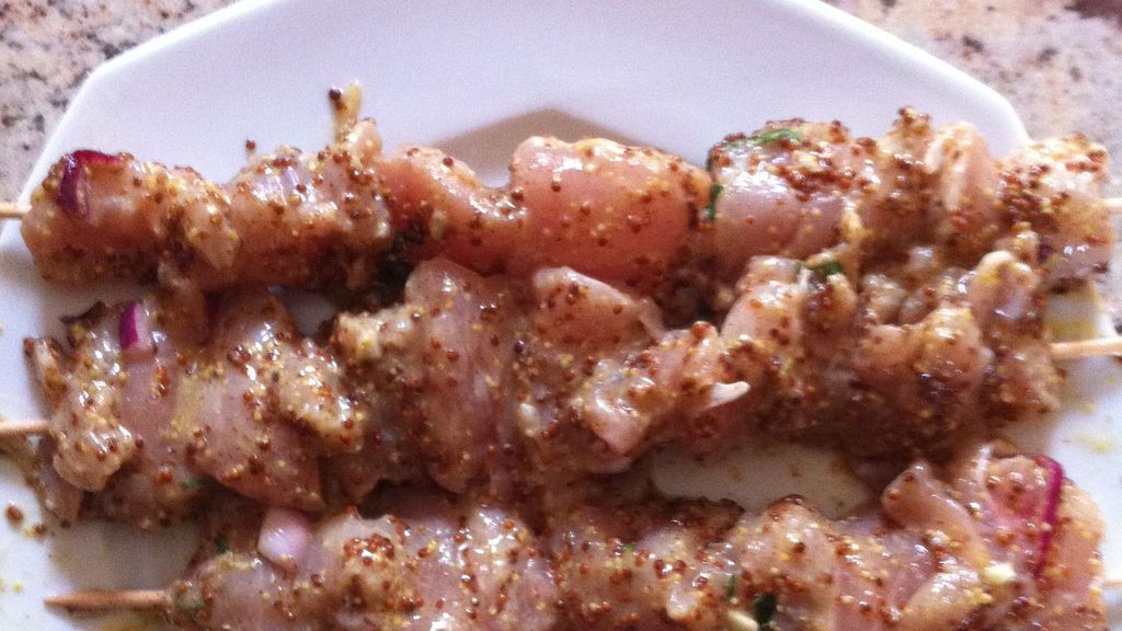 Brochettes de poulet marinées au miel et à la moutarde à l'ancienne : cette preparation culinaire met en valeur des…