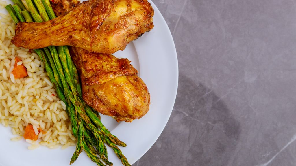 Poulet fermier poché, sauce suprême au vin jaune, riz pilaf, asperges blanches rôties : cette preparation culinaire met en valeur…
