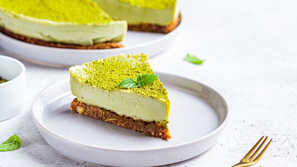 Cheese-cake sans cuisson au thé matcha (végétalien) : cette preparation culinaire met en valeur des ingredients de qualite.