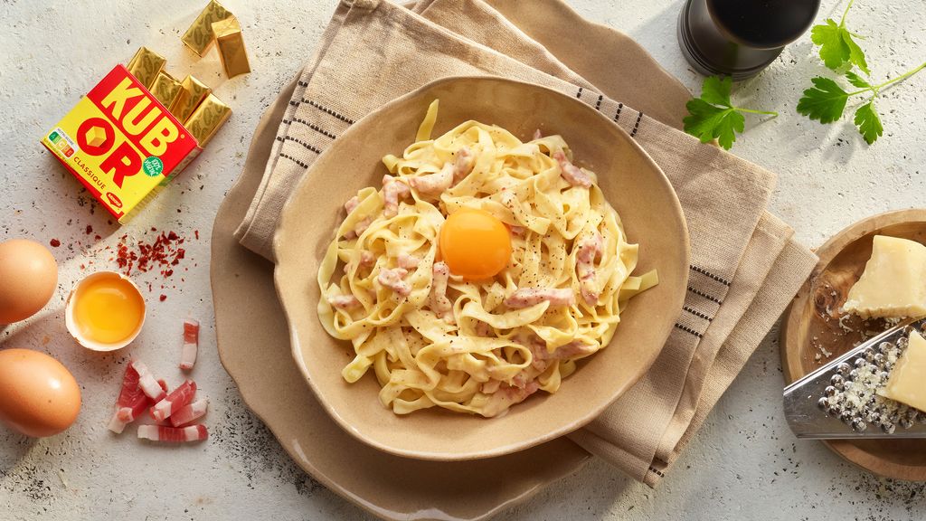 Tagliatelles à la carbonara (version française) : une recette gourmande et raffinee qui seduit par ses saveur authentiques.
