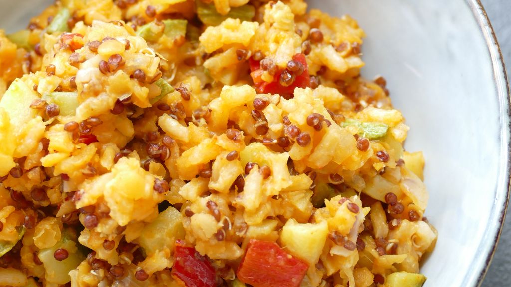 Trio lentilles quinoa riz pimenté aux petits légumes, vegan et délicieux : cette preparation culinaire met en valeur des ingredients…