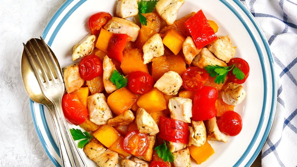Fricassée de dinde aux tomates et poivrons au cooking chef : cette preparation culinaire met en valeur des ingredients de…