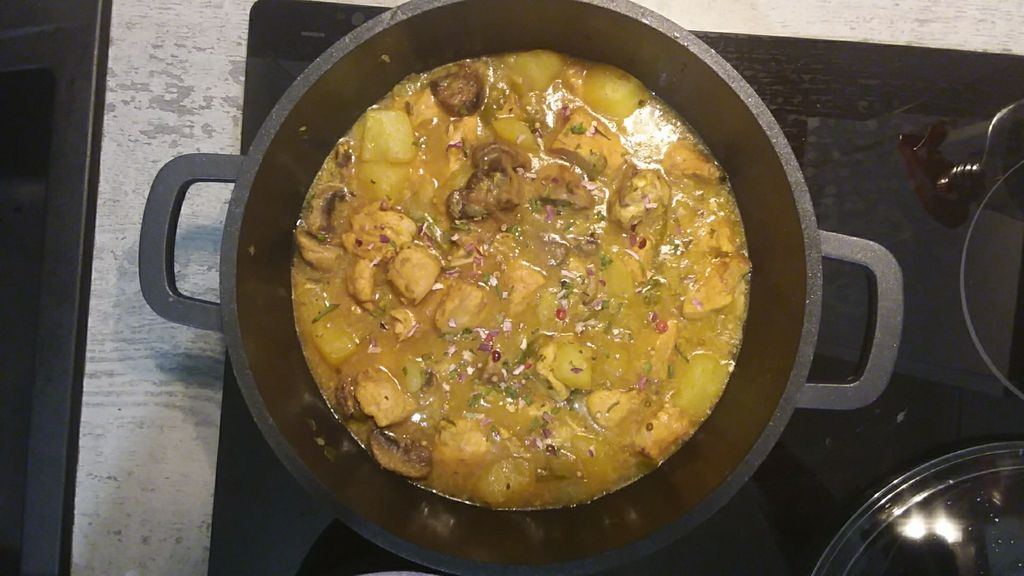 Poêlée de poulet, champignons et oignons accompagnée de pomme de terre : une recette gourmande et raffinee qui seduit par…