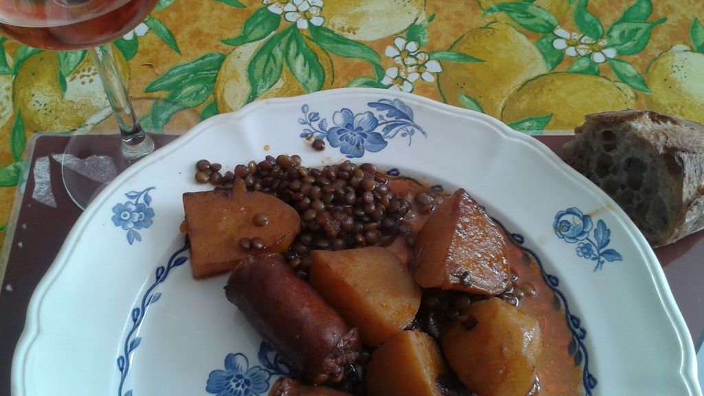 Ragoût de lentilles en sauce et saucisses : cette preparation culinaire met en valeur des ingredients de qualite.
