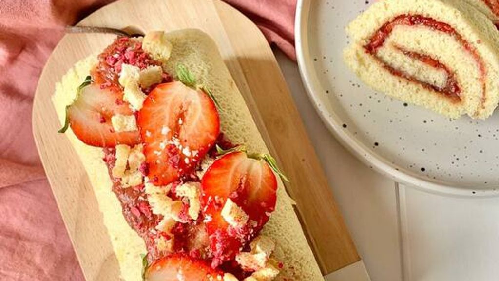 Gâteau roulé à la confiture de rhubarbe, fraises et graines de chia (sans lactose) : decouvrez cette recette savoureuse, facile…