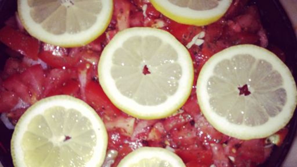 Poisson, tomate, ail, basilic citron, coriandre, purée de piment, sel, huile d'olive