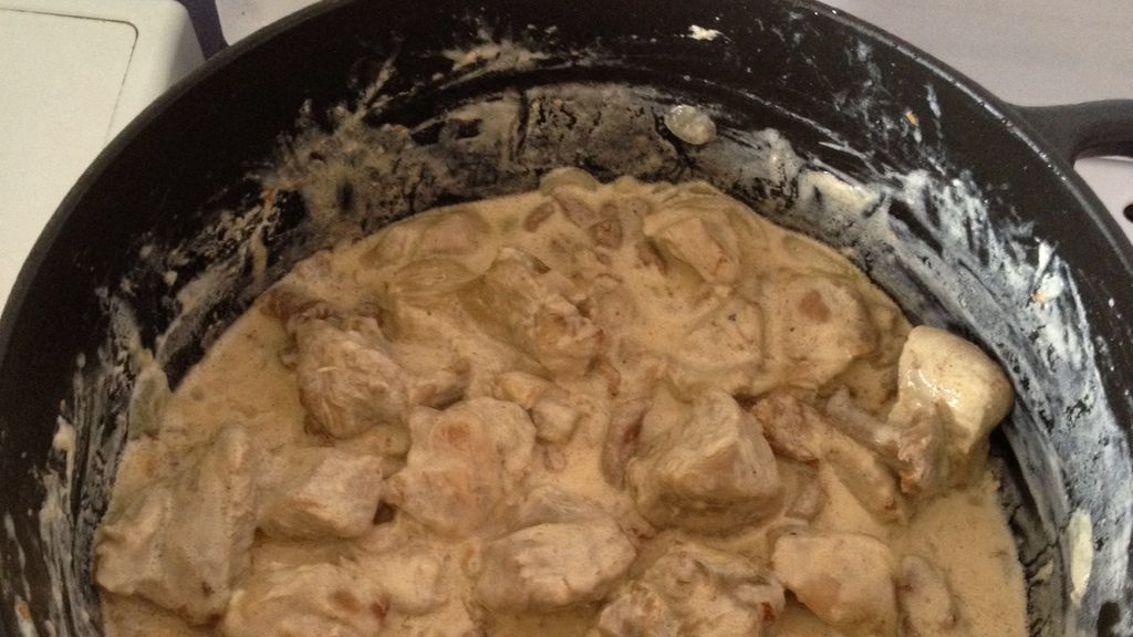 sauté de veau, moutarde à l'ancienne, oignon, girolles, crème fraîche, gingembre, muscade, poivre, sel, huile, beurre