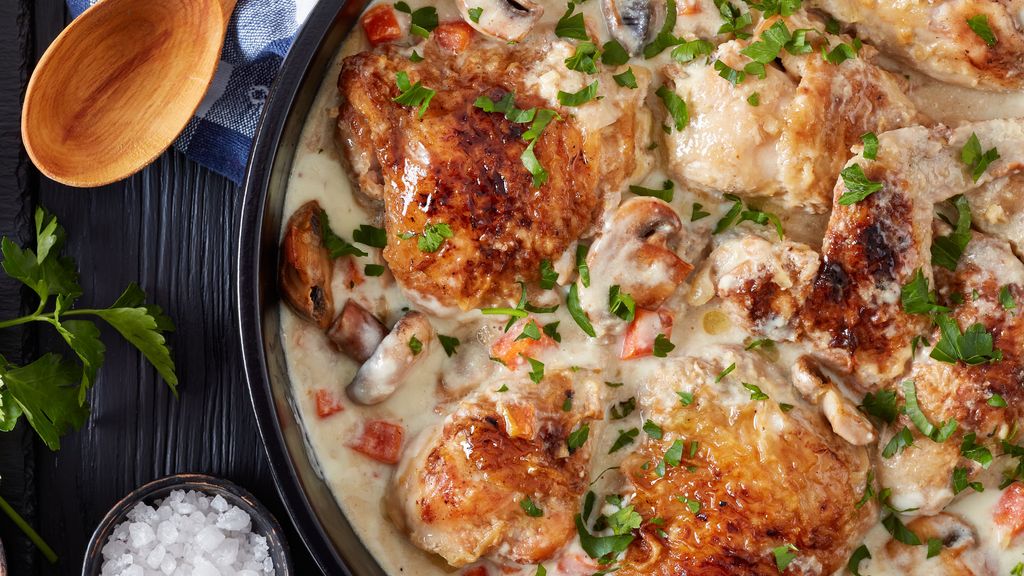 cuisse de poulet, oignon, ail, crème fraîche épaisse, champignon, farine, fond, persil