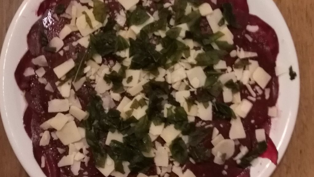 Carpaccio de betterave crue, parmesan et basilic : cette preparation culinaire met en valeur des ingredients de qualite.