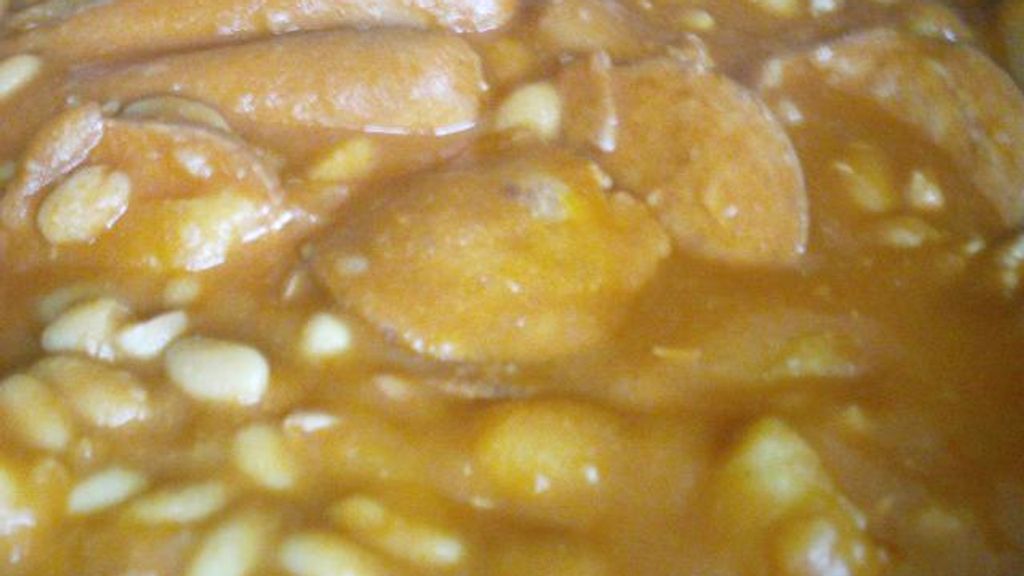 saucisse de Strasbourg, saucisson à l'ail, haricot, purée de tomate, lardons fumés, poivre