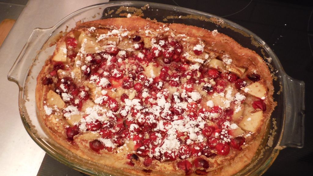 cranberries, pomme, sucre, farine, oeuf, crème épaisse, lait, sucre glace, cannelle, sel, beurre, sucre en poudre