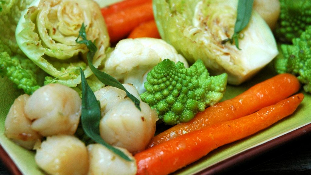 noix de pétoncle, carotte, chou blanc, poireau, échalote, crème fraîche, safran, poivre, sel