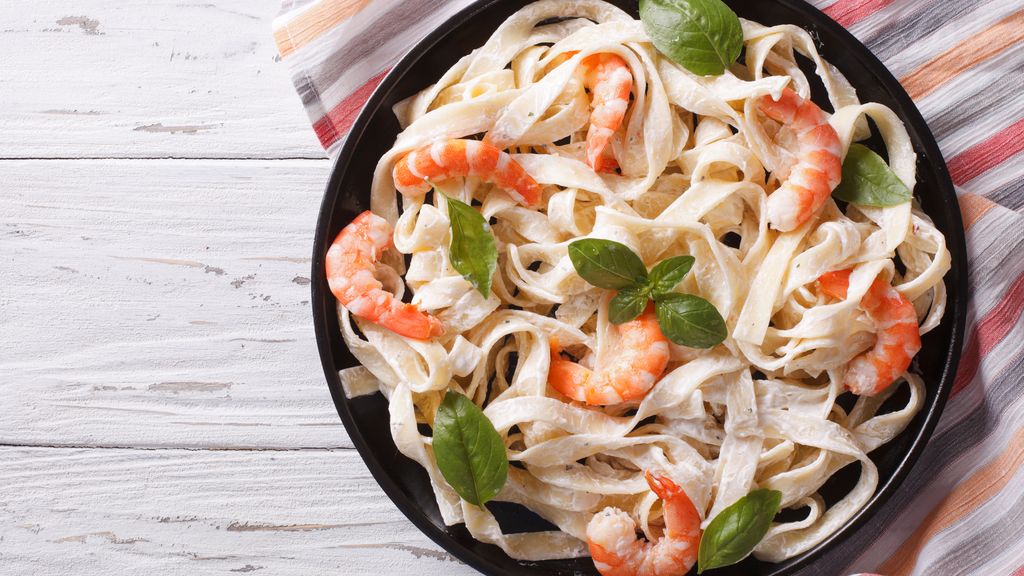 pâtes, crevettes, tomate, oignon, crème fraîche, persil, sel, poivre