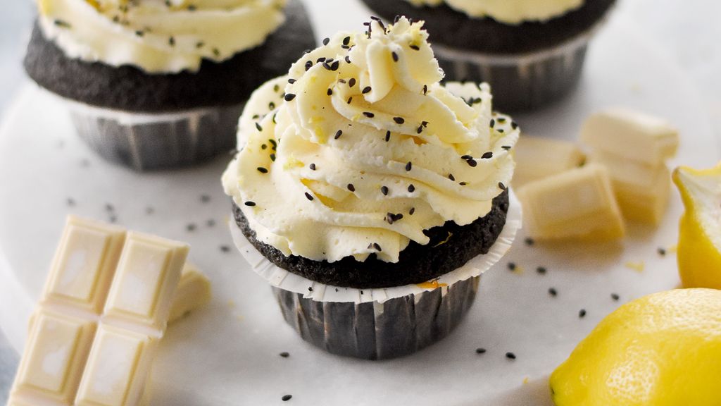 farine, beurre, sucre, oeuf, levure chimique, lait, lemon curd, citron, charbon actif, chocolat blanc, crème liquide, citron, graines de sésame