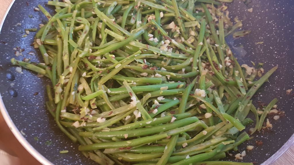 haricots verts, beurre, cumin, ail, gingembre, crème fraîche, jus de citron, coriandre, couteau, poivre, sel