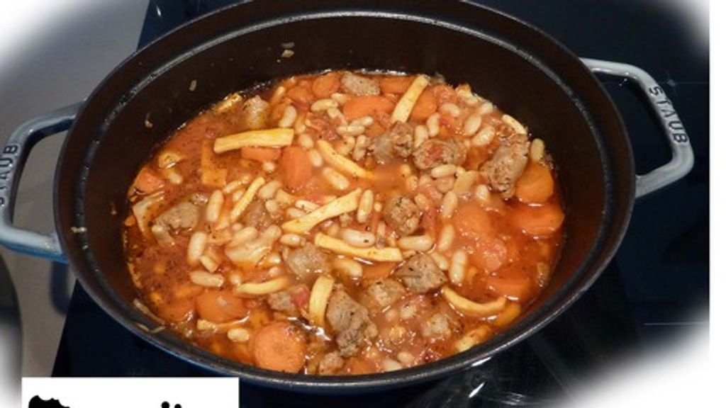 haricot, carotte, oignon, ail, saucisse de Toulouse, calamar, pulpe de tomate, sel, poivre, piment, herbes de Provence, laurier, huile d'olive,…