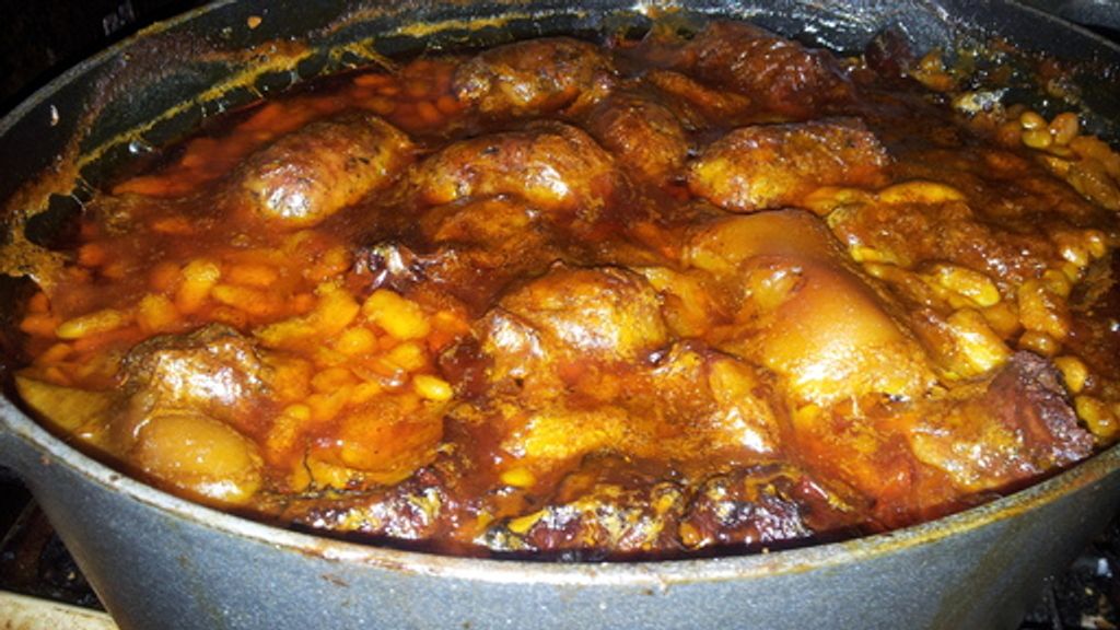 haricot, saucisse, saucisse, poitrine de porc, porc, oignon, ail, thym, laurier, curcuma, clou de girofle, gingembre, poivre, canard, tomate