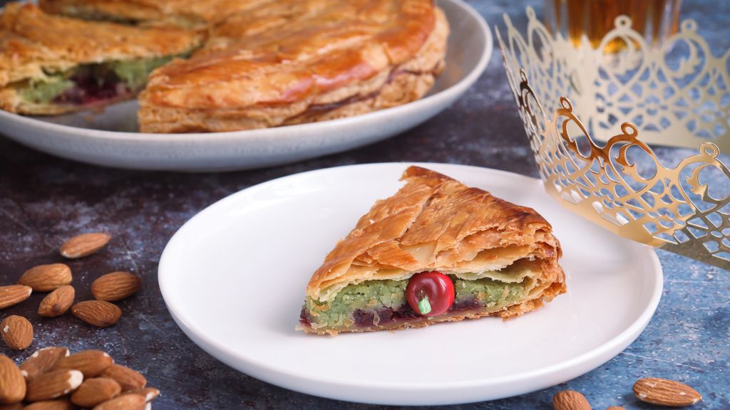 pâte feuilletée, amandes en poudre, griotte, pistaches, oeuf, beurre tendre, fèves