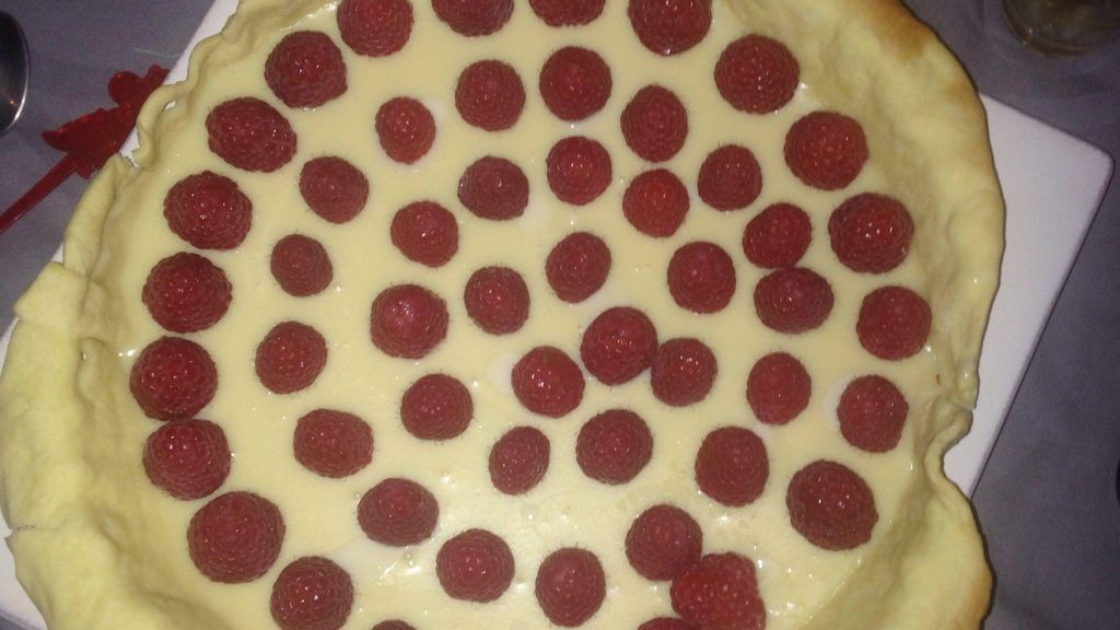 pâte brisée, chocolat blanc, crème liquide, Gélatine, framboises