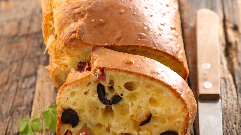 lardons, olives, tomate séchée à l'huile d'olive, emmental, farine, oeuf, huile, lait, levure chimique, sel et poivre