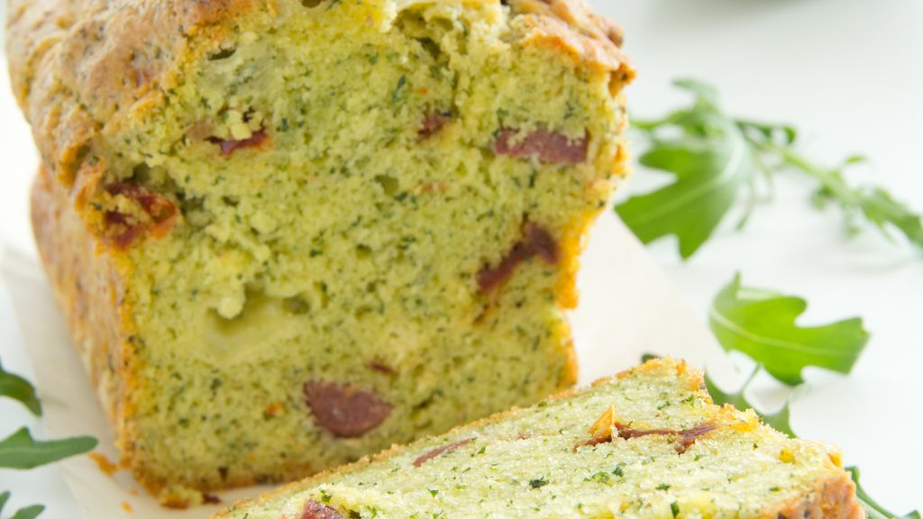 lardons, olives, tomate séchée à l'huile d'olive, emmental, farine, oeuf, huile, lait, levure chimique, sel et poivre