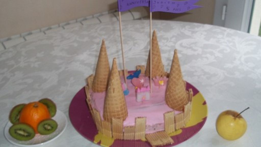 génoise, sucre glace, blanc d'oeuf, jus de citron, colorant alimentaire, cornet de glace, gaufrette, orange, kiwi, pomme
