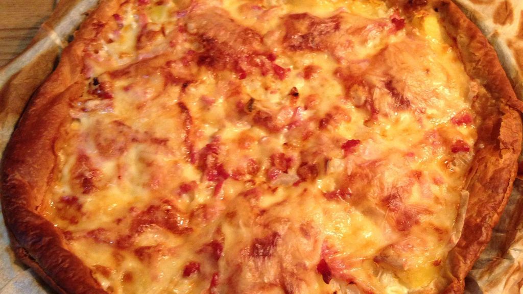 pâte feuilletée, pomme de terre, lardons, fromage à raclette, oignon