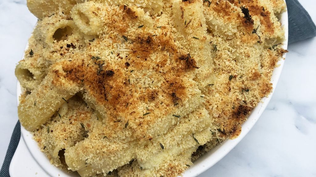 rigatoni, lait, fécule de maïs, chèvre frais, poivre, chapelure, zeste de citron, thym, parmesan, ail semoule