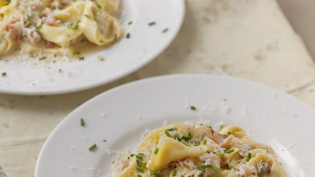 ravioli, pancetta, brique, ciboulette, épices à colombo, sel