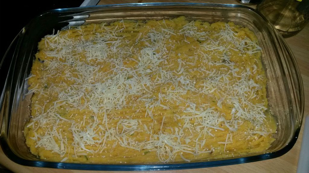 viande hachée, courge, carotte, pomme de terre, oignon, beurre, crème fraîche épaisse, vin blanc, muscade, parmesan, persil, sel, poivre