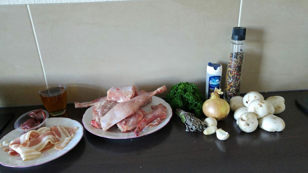 lapin, alcool de genièvre, vin blanc sec, genièvre, poivre, sel, estragon, oignon, ail, lard, moules