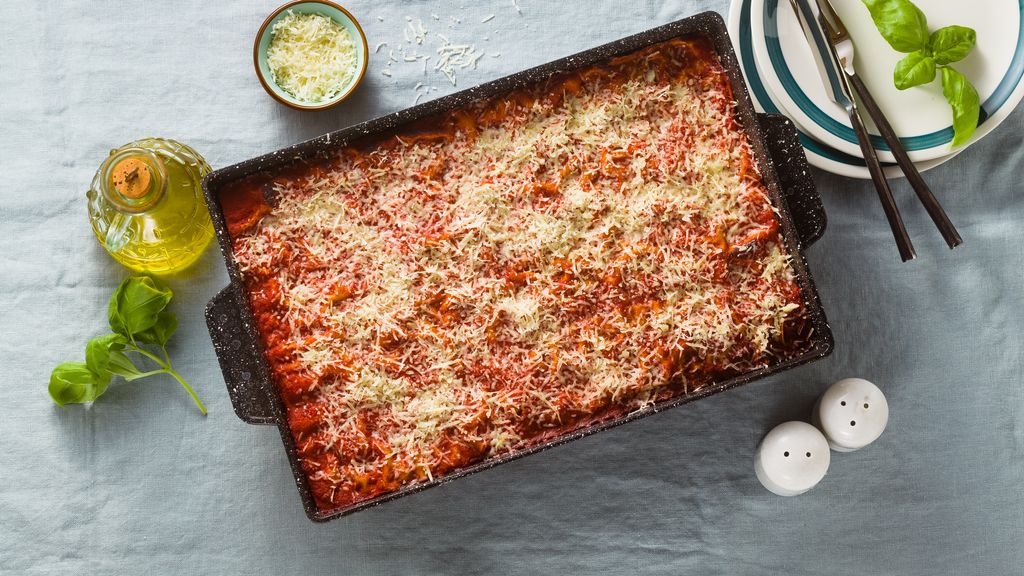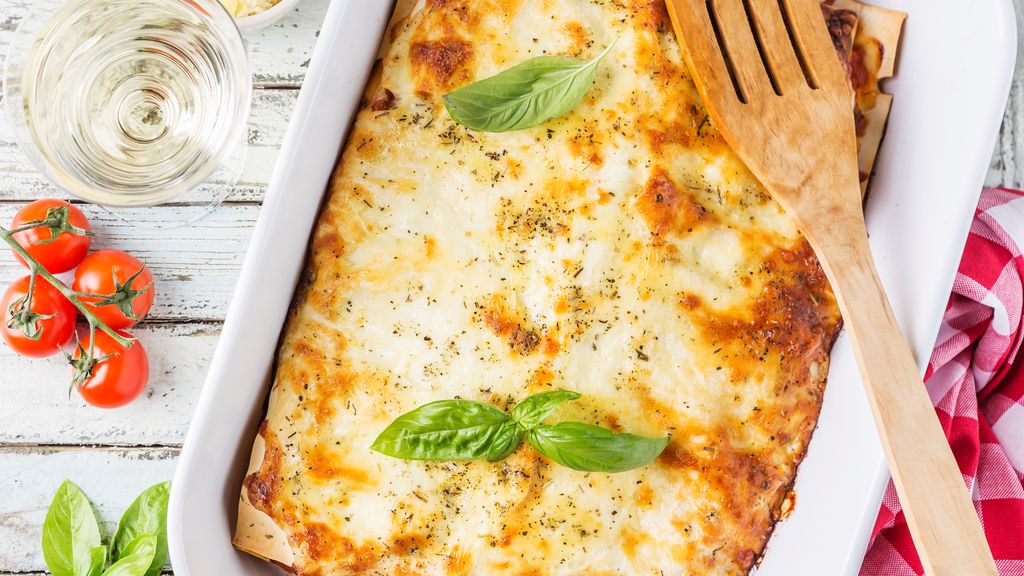 boeuf haché, pâtes à lasagnes, oignon jaune, ail, céleri branche, carotte, purée de tomate, vin rouge, fromage râpé, parmesan, huile…