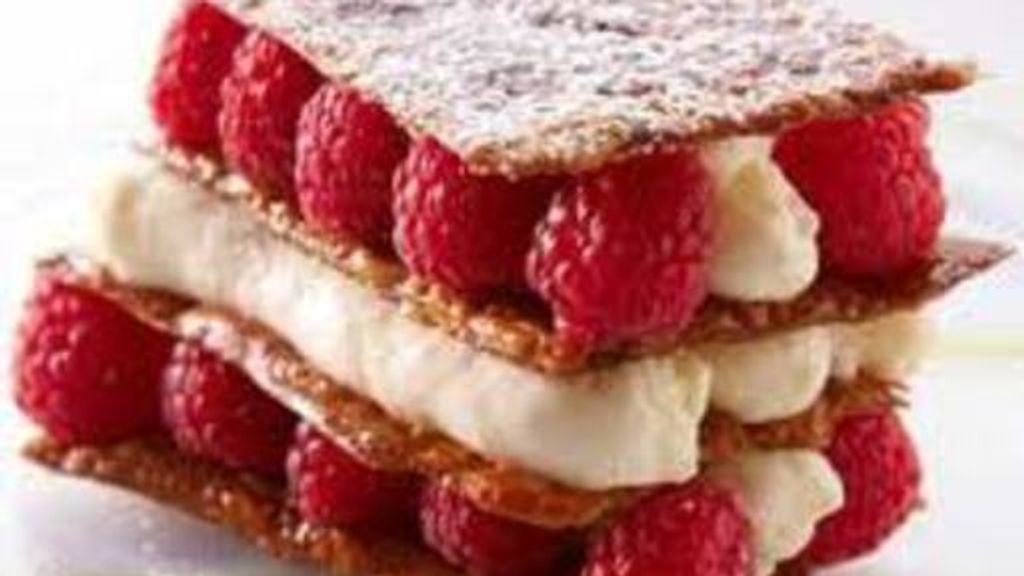 pâte feuilletée, framboises, lait entier, jaune d'oeuf, sucre en poudre, farine, maïzena, vanille, beurre, gelée, sucre glace