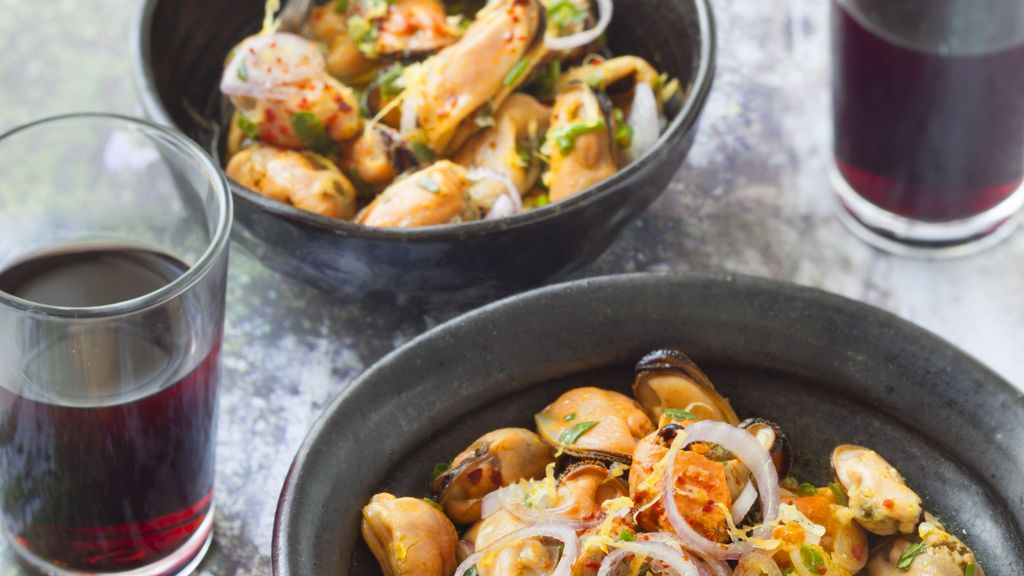 moules, huile d'olive, citron, ail, persil, herbes de Provence, vinaigre de cidre, échalote, safran, piment