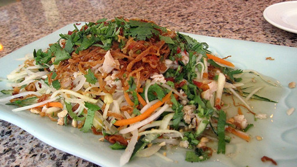 blanc de poulet, germes de soja, carotte, poivron rouge, arachide, sésame, oignon, menthe, nuoc mam, sucre, vinaigre balsamique, huile, eau,…